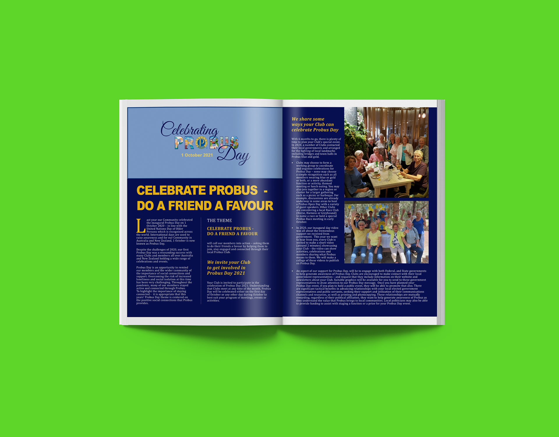 56 Page Full Magazine Editorial design & article copy-writing for 'Active Retirees' April-May 2021 - an initiative of 'Probus South Pacific Limited.' Produced and distributed bi-quarterly to over 125,000 lifetime club members from 1,700 Probus Clubs across Australia and New Zealand.